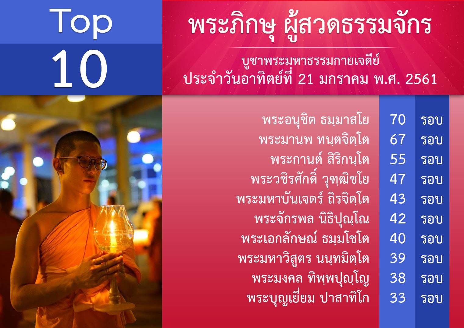 (อาทิตย์ที่ 21 ม.ค. 61) อนุโมทนาบุญกับ ผู้สวดธัมมจักกัปปวัตตนสูตรทุกท่าน ทั้งที่มีรายชื่อและไม่ได้มีรายชื่อ แต่ทำหน้าที่ด้วยหัวใจที่ยิ่งใหญ่ ทั้งสวดเองและทำหน้าที่เป็นกัลยาณมิตร ขออนุโมทนาชื่นชมด้วยใจจริง สาธุๆ เป้าต่อไป วันมหาปูชนียาจารย์ เสาร์ที่ 3 กุมภาพันธ์ พ.ศ. 2561 ด้วยตัวเลข 353,333,333 จบ ✌️✊️✊️✊️✊️✌️ สวดให้ถูกหลักวิชชา สวดด้วย >จิตที่เกษมจริงๆ >มีความสุข >มีความบริสุทธิ์ >ปลื้มทุกจบ เช็ดยอดสวดสดๆ ด้วยคอม http://mypapalove.net/dmk/v43 เช็คยอดสวดด้วยมือถือ http://mypapalove.net/dmk/mobile ส่งยอดจำนวนสวดธัมมจักกัปปวัตตนสูตร และ ส่งผลการปฏิบัติธรรม : http://www.forbrighterworld.com/ #สวดธัมมจักกัปปวัตตนสูตร