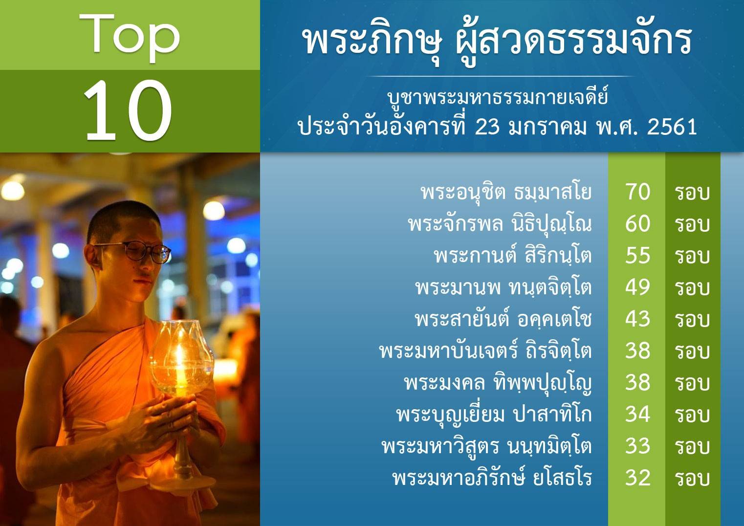 อนุโมทนาบุญกับ ผู้สวดธัมมจักกัปปวัตตนสูตรทุกท่าน เมื่อวันอังคารที่ 23 มกราคม พ.ศ.2561 ทั้งที่มีรายชื่อและไม่ได้มีรายชื่อ แต่ทำหน้าที่ด้วยหัวใจที่ยิ่งใหญ่ ทั้งสวดเองและทำหน้าที่เป็นกัลยาณมิตร ขออนุโมทนาชื่นชมด้วยใจจริง สาธุๆ เป้าต่อไป วันมหาปูชนียาจารย์ เสาร์ที่ 3 กุมภาพันธ์ พ.ศ. 2561 ด้วยตัวเลข 353,333,333 จบ ✌️✊️✊️✊️✊️✌️ สวดให้ถูกหลักวิชชา สวดด้วย >จิตที่เกษมจริงๆ >มีความสุข >มีความบริสุทธิ์ >ปลื้มทุกจบ เช็ดยอดสวดสดๆ ด้วยคอม http://mypapalove.net/dmk/v43 เช็คยอดสวดด้วยมือถือ http://mypapalove.net/dmk/mobile ส่งยอดจำนวนสวดธัมมจักกัปปวัตตนสูตร และ ส่งผลการปฏิบัติธรรม : http://www.forbrighterworld.com/ #สวดธัมมจักกัปปวัตตนสูตร