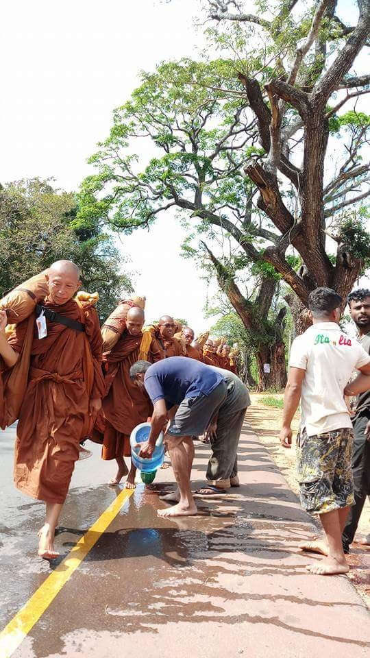 พระไทยเดินเท้าเปล่าแสวงบุญที่ศรีลังกา ชาวบ้านช่วยกันเอาน้ำราดพื้นถนน สาธุๆ ที่มา พัทธ์ชลิตา เรืองโรจนารัชต์