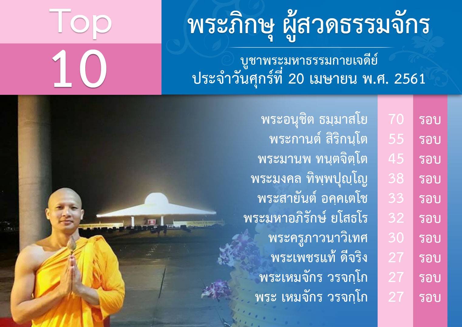 ยอดสวดเมื่อวันศุกร์ที่ 20 เม.ย. พ.ศ.2561 สาธุ สาธุ วันคุ้มครองโลก – Earth Day 22 เมษายน 2561 ณ วัดพระธรรมกาย ------------------- ภาคเช้า : พิธีตักบาตร ภาคสาย : ปฏิบัติธรรม ร่วมพิธีบูชาข้าวพระ ภาคบ่าย : พิธีทอดผ้าป่าบำรุงวัด ครั้งที่ 1/2561 ภาคค่ำ : พิธีย่ำระฆังทองระฆังธรรม ฉลองชัย ชิตัง เม สวดธรรมจักร วันคุ้มครองโลก วันอาทิตย์ที่ 22 เมษายน เป้าของเราคือ 466,666,666 จบ อีก 2 วัน ✌️✊️✊️✊️✊️✌️ สวดให้ถูกหลักวิชชา สวดด้วย >จิตที่เกษมจริงๆ >มีความสุข >มีความบริสุทธิ์ >ปลื้มทุกจบ เช็ดยอดสวดสดๆ ด้วยคอม http://mypapalove.net/dmk/v43 เช็คยอดสวดด้วยมือถือ http://mypapalove.net/dmk/mobile ส่งยอดจำนวนสวดธัมมจักกัปปวัตตนสูตร และ ส่งผลการปฏิบัติธรรม : http://www.forbrighterworld.com/ #สวดธัมมจักกัปปวัตตนสูตร