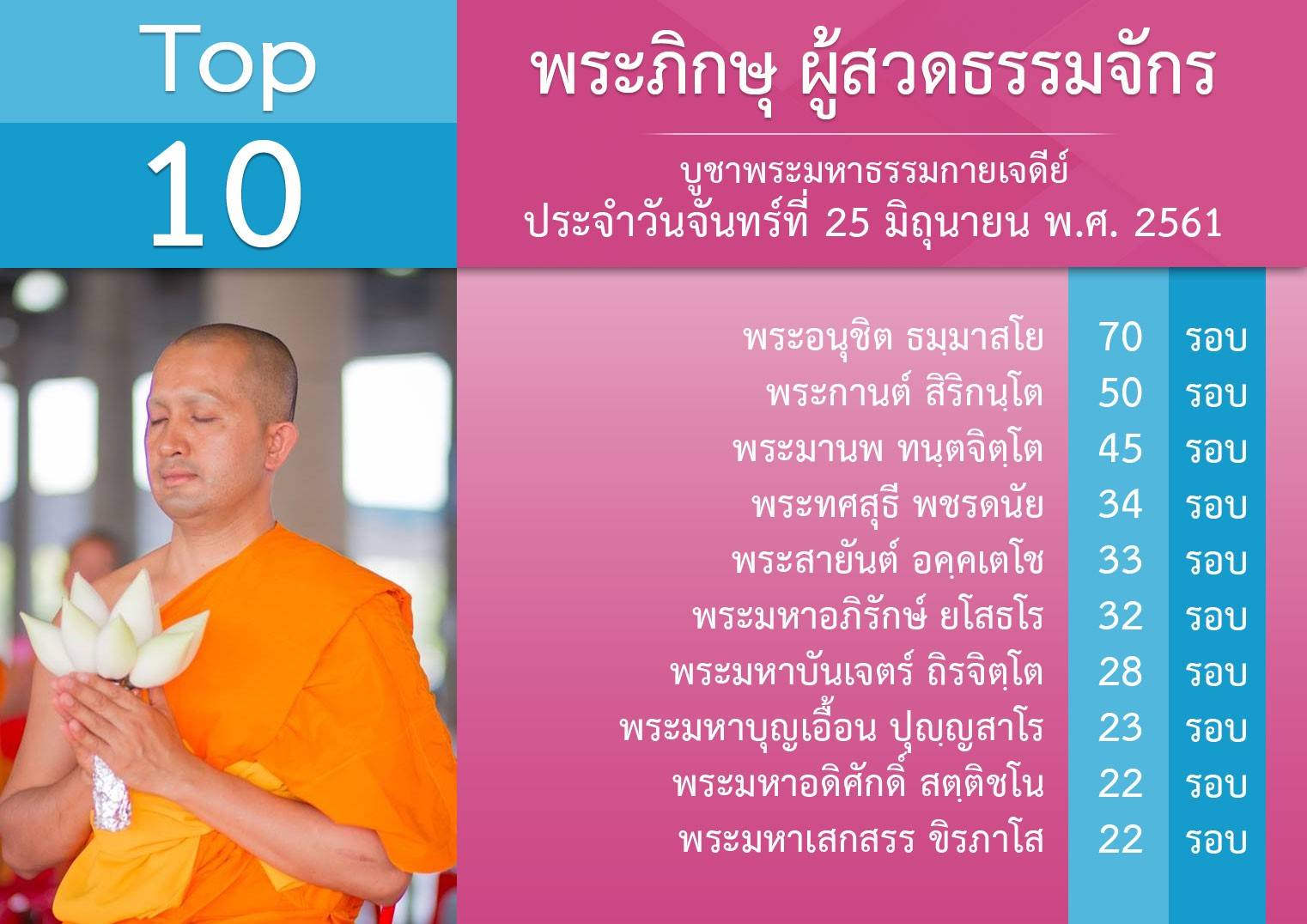 ยอดสวดเมื่อวันจันทร์ที่ 25 อังคารที่ 26 และพุธที่ 27 มิ.ย. พ.ศ.2561 สาธุ สาธุ “!!! เป้าต่อไป วันอาสาฬหบูชา (ศุกร์ที่ 27 กรกฎาคม พ.ศ.2561) ขอเชิญร่วมสวดธรรมจักรในวันวิสาขบูชานี้ ขยับเป้าเป็น 585,858,585จบ • สวดธรรมจักร สำคัญ มากนะ บุญเกิดขึ้นทุกอักขระเลย ไม่ใช่ แค่ บอ-สระอุ-ญ แต่...กระแสธารแห่งบุญ เกิดขึ้นจริงๆ ในทุกอักขระที่เกิดจาก การสวดธรรมจักร ด้วยจิตที่เลื่อมใส สวดด้วยความเคารพ ที่ผ่านมาเราสวดแล้ว ถึง 500 กว่าล้านจบ บุญจะเกิดขึ้นเยอะ ขนาดไหน • เพราะฉะนั้น ให้ตั้งใจ กันให้ดีนะ สวดให้ถูกหลักวิชชา สวดด้วยความปลื้ม มีความสุข ความบริสุทธิ์ มีจิตเกษม และไปให้ถึงเป้า ~~~~~•••~~~~~ Cr : หิ่งห้อยส่งข่าว (๒๖ พ.ค. ๒๕๖๑ ) ✌️✊️✊️✊️✊️✌️ • ให้มาสวดธรรมจักร หน้า”พระมหาธรรมกายเจดีย์ พระมหาเจดีย์พระพุทธเจ้าล้านพระองค์” มากันให้เยอะๆ เพราะที่ตรงนี้สำคัญมากๆๆๆ ~~~~~•••~~~~~ Cr : หิ่งห้อยส่งข่าว ( 9/6/61 ) สวดให้ถูกหลักวิชชา สวดด้วย >จิตที่เกษมจริงๆ >มีความสุข >มีความบริสุทธิ์ >ปลื้มทุกจบ เช็ดยอดสวดสดๆ ด้วยคอม http://mypapalove.net/dmk/v43 เช็คยอดสวดด้วยมือถือ http://mypapalove.net/dmk/mobile ส่งยอดจำนวนสวดธัมมจักกัปปวัตตนสูตร และ ส่งผลการปฏิบัติธรรม : http://www.forbrighterworld.com/ ปล.!!!>นับยอดสวดเพื่อจัดอันดับ จากการใส่ยอดสวด ท้่ายการบ้านตาอินตานา #สวดธัมมจักกัปปวัตตนสูตร