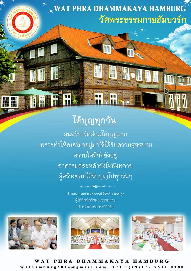 หลังจากที่ได้มาเช่าที่ทำเป็นวัดพุทธฮัมบวร์ก ถึง ๗ ปี แล้วนั้น บัดนี้ถึงเวลาที่จะได้รวมใจ สาธุชนเหล่าศิษยานุศิษย์ ลูกหลานหลวงปู่ มาปักหลักพระศาสนาในเมืองฮัมบวร์ก ประเทศสหพันธรัฐเยอรมัน ให้มั่นคง