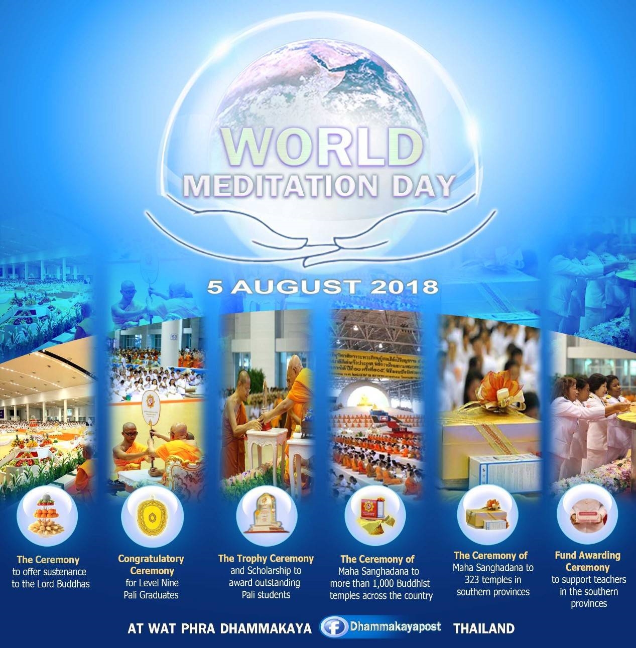 6 Meritorious Events on WORLD MEDITATION DAY 世界静坐日六大殊胜功德 5 August 2018 1.Meditation and ceremony to offer sustenance to the Lord Buddhas. 2. The 31st year of Congratulatory Ceremony for Level Nine Pali Graduates (all 51 monks throughout Thailand). 3. The 15th year of the Trophy Ceremony and Scholarship to award outstanding Pali students. 4. The 19th year of Ceremony of Maha Sanghadana to more than 1,000 Buddhist temples across the country. 5. The 14th year Ceremony of Maha Sanghadana to 323 temples in southern provinces. 6. The 11th year of Fund Awarding Ceremony to support teachers in the southern provinces. At The Main Assembly Hall of Wat Phra Dhammakaya, Thailand. https://www.facebook.com/DhammakayaPost/ 1. 连续50多年荟供、共修法会 2. 第31年庆祝巴利文九级比丘毕业典礼仪式 3. 第15年向模范佛学院颁发荣誉证书和奖学金仪式 4. 第19年供养1000所寺院斋僧活动 5. 第137届供养泰南323所寺院斋僧活动 6. 第102届向泰南四府教师颁发基金仪式 六大殊胜功德法会将于2018年8月5日在泰国法身寺举行,诚邀八方大德莅临与会,共沾法喜。