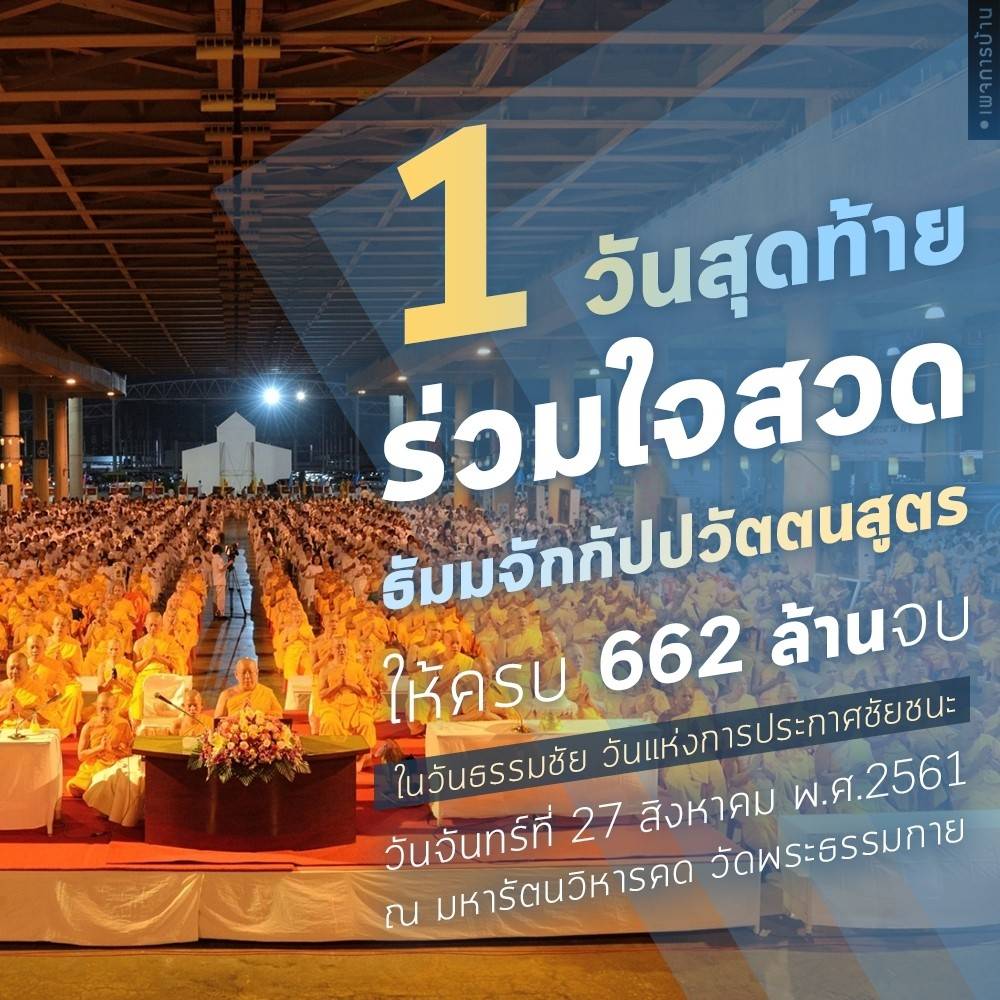 ยอดสวด เมื่อวันศุกร์ที่ 24 ส.ค . พ.ศ.2561 อนุโมทนาบุญ สาธุ สาธุ 🛑สวดธรรมจักร เป้า662ล้านจบ บูชาธรรมเนื่องในวันธรรมชัย🛑 🎯ยอด 22 ส.ค. 61 ได้ 3.1ล้านจบ เหลือ 17ล้านจบ จะถึงเป้าหมายในอีก 5 วัน ต้องสวดได้วันละ 3.4ล้านจบ ... ลูกๆรวมใจทำงานเป็นทีม จะพิชิตทุกภารกิจ สำเร็จทุกเป้าหมายครับ 👏วันนี้ ขออนุโมทนาบุญสำนักศรัทธาภิบาล รวมใจสมาชิกทั้งสำนัก นำเครือข่ายอาสาสมัครและผู้นำบุญ สวดธรรมจักร เวียนประทักษิณ ณ พระมหาธรรมกายเจดีย์ น้อมบูชาธรรมเนื่องในวันธรรมชัย 🏆"รุกก็ยอด รับก็เยี่ยม เปี่ยมน้ำใจ ไร้เงื่อนไข รวมใจเป็นหนึ่ง ถึงที่สุดแห่งธรรม"🏆 🌱🌱🌱⚘⚘⚘🌱🌱🌱 ✉ขอเรียนเชิญสมาชิกเขตใน เจ้าหน้าที่ ผู้นำบุญ สาธุชน ร่วมกิจกรรมสวดธรรมจักร เวียนประทักษิณ ณ พระมหาธรรมกายเจดีย์ บูชาธรรมเนื่องในวันธรรมชัย ระหว่างวันที่ 21-27 ส.ค. 61 ⏲16.00-17.00น. สวดธรรมจักร แนวกลาง ⏲17.00-18.00น. ร่วมขบวนเวียนประทักษิณ ✔21 ส.ค. นำโดย สำนักกัลยาณมิตรสากล, ภาคจักรวาล ✔22 ส.ค. นำโดย สำนักศรัทธาภิบาล 🚩23 ส.ค. นำโดย สำนักบุคคลกลาง, สำนักเผยแผ่, พระธรรมทายาทรุ่นบูชาธรรมวันธรรมชัย, อาศรมบรรพชิต, อาศรมอุบาสก, อาศรมอุบาสิกา 🚩24 ส.ค. นำโดย สำนักองค์ประธาน, สมาชิกหอฉัน, กองประณีตศิลป์ 🚩25 ส.ค. นำโดย สำนักปริยัติธรรม, พระธรรมทายาทรุ่นเข้าพรรษา, หมู่กุฏิสามเณร 🚩26 ส.ค. นำโดย สำนักการศึกษา, สำนักต่างประเทศ, กองEOS 🚩27 ส.ค. สำนักสาธารณูปการ 🙏ขอกราบอนุโมทนาบุญทุกท่าน ทุกทีมงานครับ🙏 ⚠️ข่าวด่วน!..สำคัญมากๆ!!!⚠️ ถึง..ลูกพระธัมฯทั่วโลก พันธุ์หัวใจไม่เกี่ยง 🔊 สวดธรรมจักร 662 ล้านจบ กตัญญูบูชา วันธรรมชัย 27 สิงหาคม 🕯ช้าไม่ได้..7วันนี้ เราต้องสร้างบารมีเพิ่มขึ้นอย่างน้อย 2 เท่า รวมใจชวนกันมาสวดให้เยอะที่สุด ด้วยจิตเกษม ปลื้มทุกจบ!! ...🎯โดยมีเป้าหมาย+หัวใจเดียวกัน ที่จะสวดธรรมจักรให้เข้าเป้าเพื่อแสดงกตัญญูบูชาในวันธรรมชัย ......วันที่พวกเราต้องชนะโดยธรรมเท่านั้น... แล้วจะปลื้มนิรันดร์ร่วมกัน ✌สูตรสำเร็จที่จะทำให้การสวดธรรมจักรเข้าเป้าในวันธรรมชัยนี้ คือ ททท. ทำทั้งทีม ทำทุกทาง ทำทันที 🌐🌐🌐🌐🌐🌐🌐 คทง.สวดธรรมจักร 🌝 ฉลองชัย!! วันธรรมชัย 27 สิงหาคม พ.ศ. 2561 สวดธรรมจักรให้ถึง 662,000,000 จบ “!!! • สวดธรรมจักร สำคัญ มากนะ บุญเกิดขึ้นทุกอักขระเลย ไม่ใช่ แค่ บอ-สระอุ-ญ แต่...กระแสธารแห่งบุญ เกิดขึ้นจริงๆ ในทุกอักขระที่เกิดจาก การสวดธรรมจักร ด้วยจิตที่เลื่อมใส สวดด้วยความเคารพ • เพราะฉะนั้น ให้ตั้งใจ กันให้ดีนะ สวดให้ถูกหลักวิชชา สวดด้วยความปลื้ม มีความสุข ความบริสุทธิ์ มีจิตเกษม และไปให้ถึงเป้า ~~~~~•••~~~~~ Cr : หิ่งห้อยส่งข่าว (๒๖ พ.ค. ๒๕๖๑ ) ✌️✊️✊️✊️✊️✌️ • ให้มาสวดธรรมจักร ห