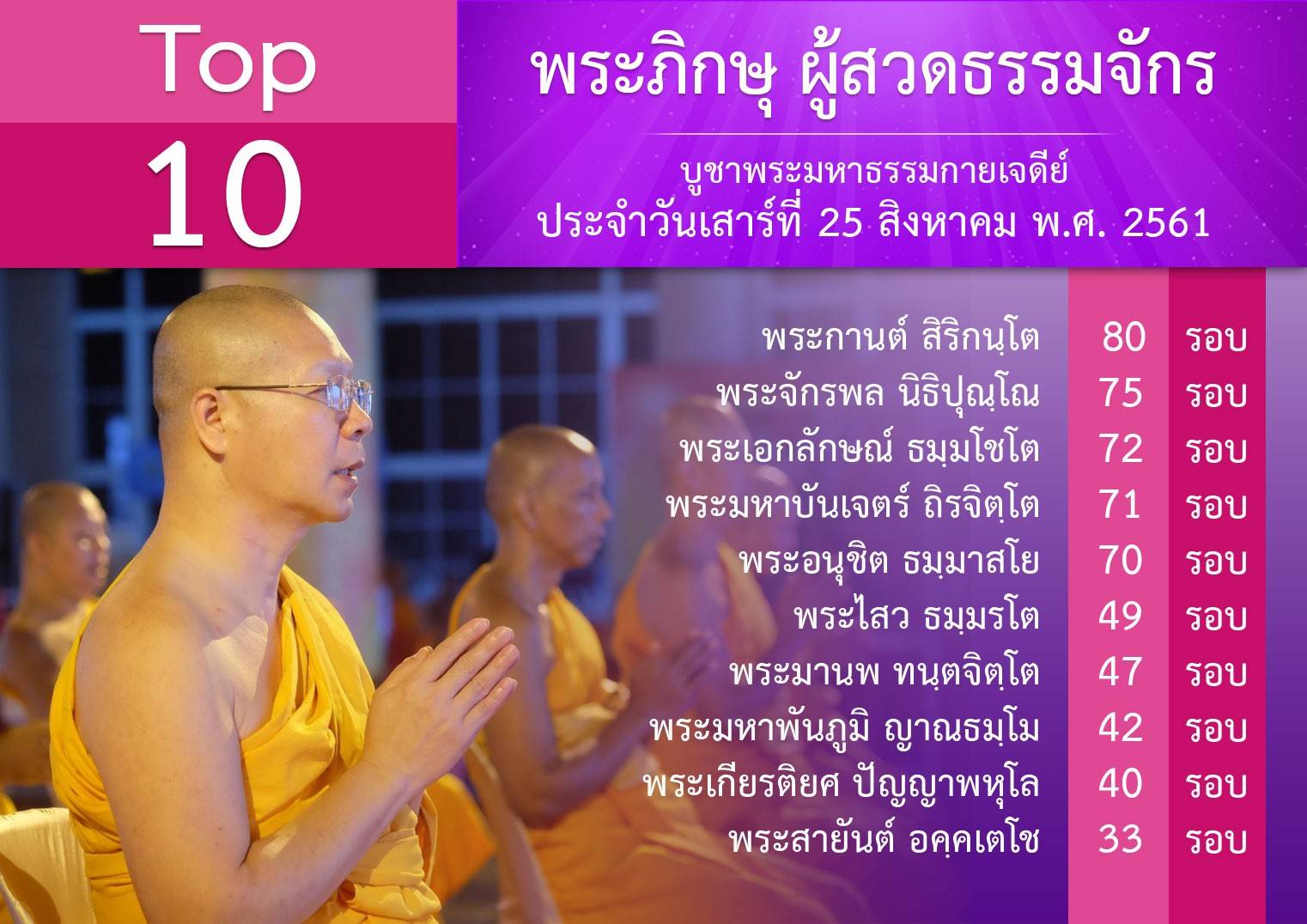 ยอดสวด เมื่อวันเสาร์ที่ 25 อาทิตย์ที่ 26 และจันทร์ที่ 27 ส.ค . พ.ศ.2561 อนุโมทนาบุญ สาธุ สาธุ 📌เห็นเป้าแล้วต้องปลื้ม📌 ~~~~~•••~~~~~ • วันครูวิชชาธรรมกาย จันทร์ ที่ 24 ก.ย.61 ปรับเป้าตัวเลข เป็น 711,101,101 จบ ลูกหลานหลวงปู่ พระผู้ปราบมาร จะพร้อมใจกัน ทั่วประเทศ และ ทั่วโลก ปฏิบัติบูชาธรรม นั่งสมาธิ ทุกวัน และ สวดธรรมจักร ให้เข้าเป้า ทั้งสวดเอง และ ชักชวนทุกๆคนร่วมกันสวด ที่ พระมหาธรรมกายเจดีย์ พระมหาเจดีย์พระพุทธเจ้า ล้านพระองค์ หรือ ตามจังหวัดต่างๆ หรือ ทั่วโลก - การสวด ให้สวดตาม หลักวิชชา - สวดจากศูนย์กลางกาย และ สวดด้วย... ~จิตที่เกษมจริงๆ ~มีความสุข ~มีความบริสุทธิ์ ~ปลื้มทุกจบ • หลวงปู่ เอาชีวิตเป็นเดิม พัน ค้นวิชชาธรรมกาย ของพระสัมมาสัมพุทธเจ้า กลับมาให้ ชาวโลกได้รู้ความจริง ของชีวิต • ลูกหลานหลวงปู่ จะแสดง ความกตัญญู บูชาในวาระครบ รอบ 101 ปี ของการ เข้าถึงธรรม ของหลวงปู่ กัน อย่างเต็มที่ 💥💥💥 ~~~~~•••~~~~~ Cr : หิ่งห้อยส่งข่าว... ....ดาวส่งสาร (28/8/61 : 15.30 น.) 🌹🙏🙏🙏🙏🙏🌹 🔊 ข่าวดี!!!..ขอเรียนเชิญ สมาชิกองค์กร ผู้นำบุญ สาธุชนทุกท่าน เข้าร่วมกิจกรรมรวมพลัง...สวดธรรมจักร เวียนประทักษิณ ณ พระมหาธรรมกายเจดีย์ บูชาธรรมครบรอบ 101 ปี วันครูผู้ค้นพบวิชชาธรรมกาย ระหว่างวันที่ 28 ส.ค. – 24 ก.ย. 61 ⏲ 16.00-17.00 น. สวดธรรมจักร บริเวณแนวกลาง ⏲ 17.00-17.30 น. ร่วมขบวนเวียนประทักษิณ ✔รายชื่อสำนักผู้นำกิจกรรม จันทร์-เสาร์ 🚩ทุกวันจันทร์ (3,10,17,24 ก.ย.) นำโดย สำนักสาธารณูปการ, สถาบันพัฒนาเยาวชนโลก 🚩ทุกวันอังคาร (28 ส.ค., 4,11,18 ก.ย.) นำโดย สำนักกัลยาณมิตรสากล 🚩ทุกวันพุธ (29 ส.ค., 5,12,19 ก.ย.) นำโดย สำนักองค์ประธาน, สำนักปธ.คกก.บริหาร , สำนักสื่อสารองค์กร, สำนักสื่อธรรมะ 🚩ทุกวันพฤหัส (30 ส.ค., 6,13,20 ก.ย.) นำโดย สำนักบุคคลกลาง, สำนักเผยแผ่, สำนักพัฒนาทรัพยากร, (อาศรมอุบาสก, อาศรมอุบาสิกา) 🚩ทุกวันศุกร์ (31 ส.ค., 7,14,21 ก.ย.) นำโดย สำนักศรัทธาภิบาล, สำนักการศึกษา, สำนักต่างประเทศ 🚩ทุกวันเสาร์ (1,8,15,22 ก.ย.) นำโดย สำนักปริยัติธรรม, สำนักสื่อDMC, สถาบันพุทธศิลป์แห่งโลก, สำนักบริการกลาง 🌲🌲🌲🙏 สวดให้ถูกหลักวิชชา สวดด้วย >จิตที่เกษมจริงๆ >มีความสุข >มีความบริสุทธิ์ >ปลื้มทุกจบ เช็ดยอดสวดสดๆ ด้วยคอม http://mypapalove.net/dmk/v43 เช็คยอดสวดด้วยมือถือ http://mypapalove.net/dmk/mobile ส่งยอดจำนวนสวดธัมมจักกัปปวัตตนสูตร และ ส่งผลการปฏิบัติธรรม : http://www.forbrighterworld.com/ ปล.!!!(>)นับยอดสวดเพื่อจัดอันดับ จากการใส่ยอดสวด ท้่ายการบ้านตาอินตานา #สวดธัมมจักกัปปวัตตนสูตร